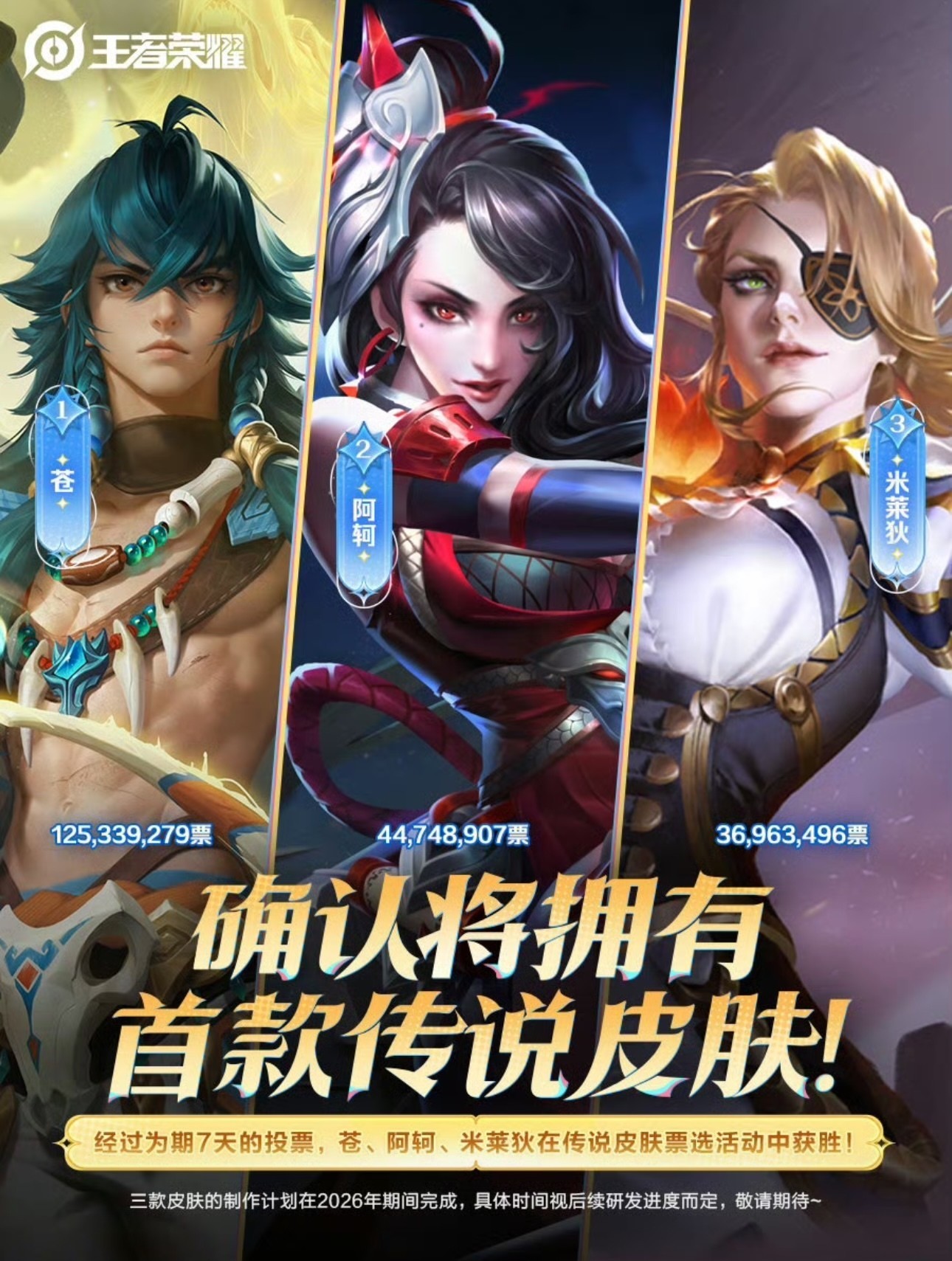 还有最近大家票选出来的三个能拥有传说皮肤的名额,分别是:苍,阿轲和米莱狄,恭喜勇者大王米莱狄也能有传说皮肤啦~